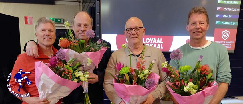 De overhandiging van een fraaie plaquette en de bijbehorende bos bloemen aan Kees Hartland, Henk Stam en Rein Schoolmeester (v.l.n.r.) was het geweldige slotstuk van de Algemene Ledenvergadering van ZVV Zaandijk op 22 maart jl. De mannen werden gehuldigd vanwege het hun 235-jarige lidmaatschap: Kees 75 jaar en Henk en Rein elk 80 jaar! Met bescheiden trots luisterden ze naar de mooie woorden van voorzitter Bart Glandorff en lieten ze zich ietwat ongemakkelijk op de gevoelige plaat vastleggen door onze fotograaf Hans Vet. Met hen ontvingen tal van trouwe Zaandijkers de Zaandijkspeld en de bos bloemen vanwege hun 25, 40 en 50-jarig lidmaatschap.