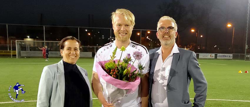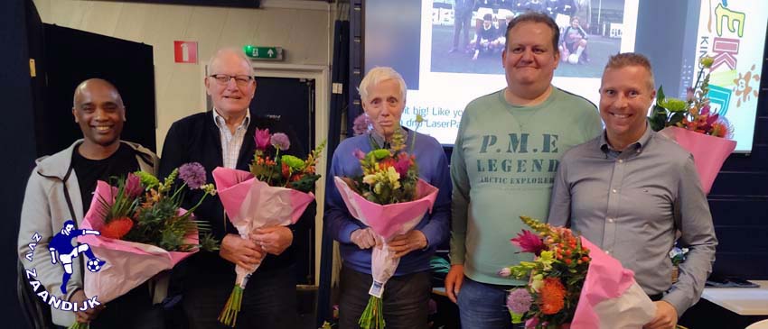 De overhandiging van een fraaie plaquette en de bijbehorende bos bloemen aan Kees Hartland, Henk Stam en Rein Schoolmeester (v.l.n.r.) was het geweldige slotstuk van de Algemene Ledenvergadering van ZVV Zaandijk op 22 maart jl. De mannen werden gehuldigd vanwege het hun 235-jarige lidmaatschap: Kees 75 jaar en Henk en Rein elk 80 jaar! Met bescheiden trots luisterden ze naar de mooie woorden van voorzitter Bart Glandorff en lieten ze zich ietwat ongemakkelijk op de gevoelige plaat vastleggen door onze fotograaf Hans Vet. Met hen ontvingen tal van trouwe Zaandijkers de Zaandijkspeld en de bos bloemen vanwege hun 25, 40 en 50-jarig lidmaatschap.